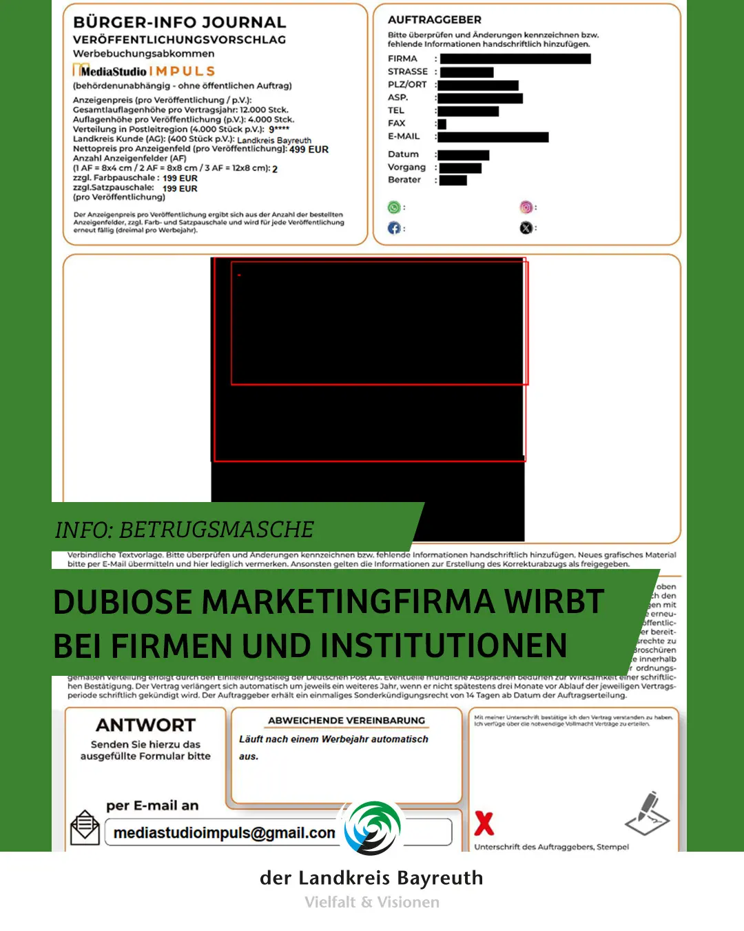 Eine dubiose Marketing-Firma meldet sich derzeit bei verschiedenen Gewerbetreibenden, Firmen und Institutionen im Landkreis und wirbt unter Angabe der E-Mail-Adresse mediastudioimpuls@gmail.com für eine kostenpflichtige Veröffentlichung von Anzeigen im angeblichen “Bürger-Info Journal des Landkreises Bayreuth“.