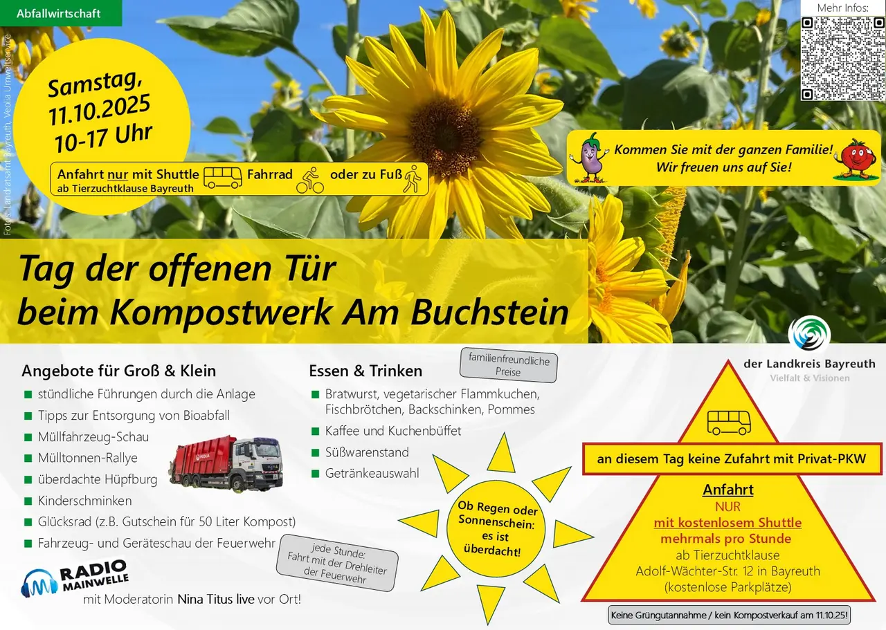 Wer immer schon mal wissen wollte, was mit dem Biomüll aus Bayreuth Stadt und Land passiert, der ist beim Tag der offenen Tür am Samstag, 11. Oktober 2025, auf der Anlage des Kompostwerks „Am Buchstein“ goldrichtig. Das Landratsamt Bayreuth lädt zu dieser Veranstaltung alle herzlich ein – es wartet von 10 bis 17 Uhr ein buntes Rahmenprogramm für Jung und Alt.