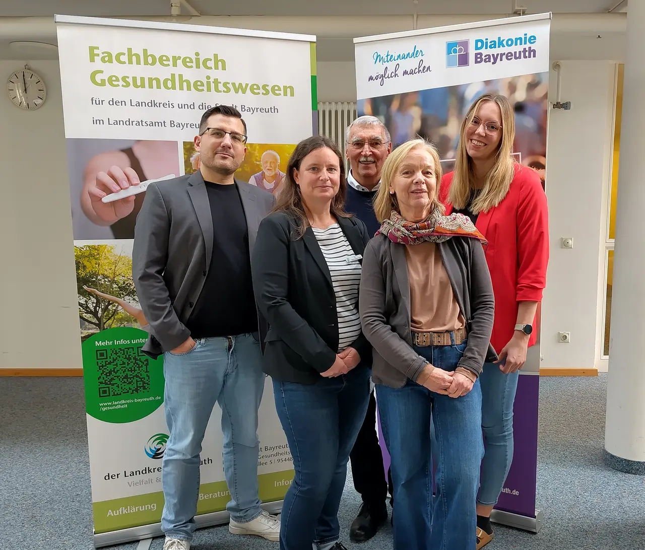 Bild 1: Organisatoren und Referenten: von links nach rechts: Thomas Helminger, Fachbereich Gesundheitswesen, Frau Dr. Hannelore Held, Fachbereichsleiterin Gesundheitswesen, Herr Dr. Fritz Seiler, ehemaliger HIV-Schwerpunktarzt, Frau Martina Höll, Leitung der Aidsberatung Oberfranken, Frau Rebecca Sausner, staatlich anerkannte Beratungsstelle für Schwangerschaftsfragen am Landratsamt Bayreuth.