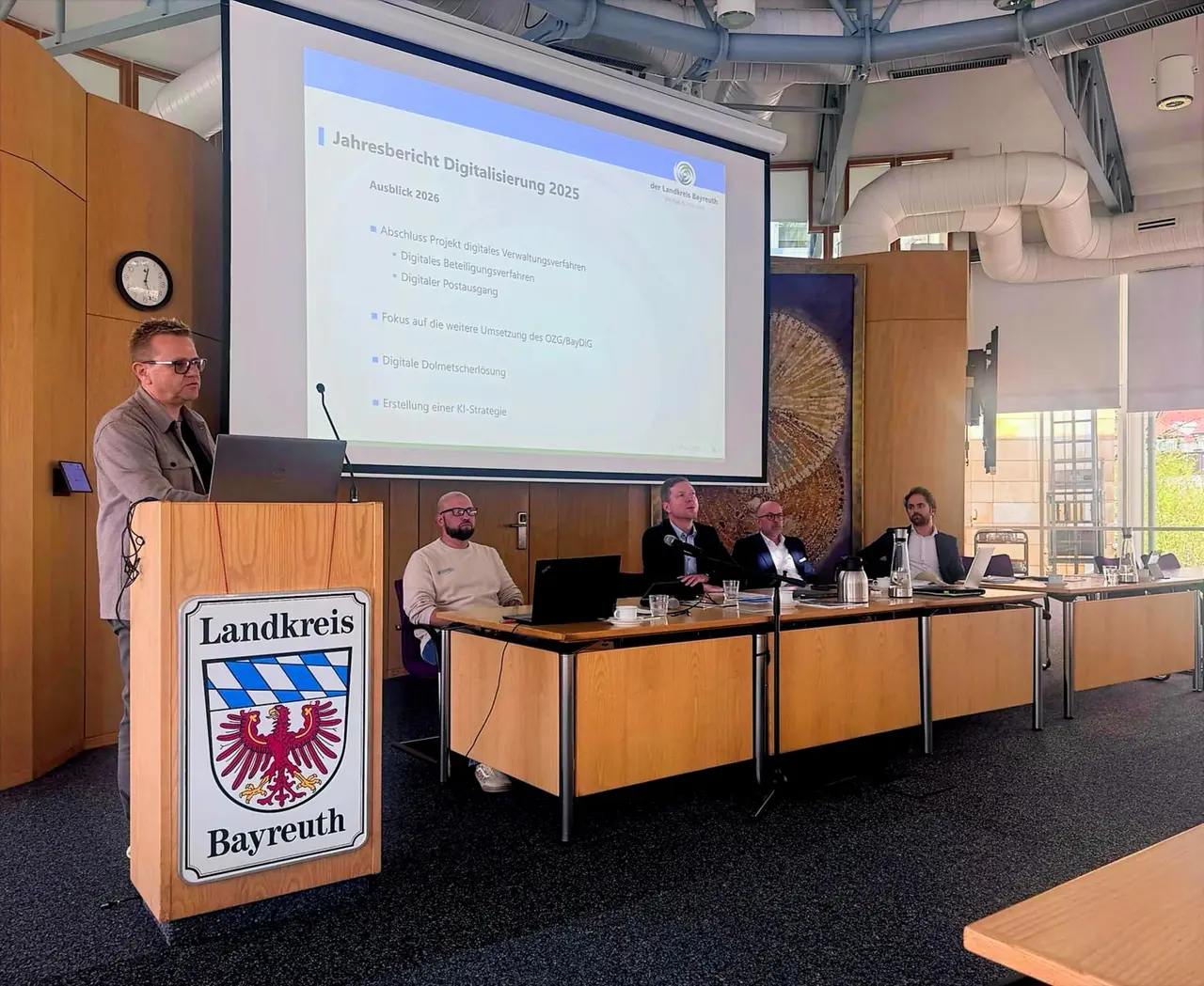 Abschließend spielte auch das Thema Digitalisierung noch eine große Rolle. Hier erläuterten Stefan Zeitler, Leiter Informations- und Kommunikationstechnik am Landratsamt Bayreuth, und Tobias Schuberth die aktuellen Entwicklungen. Unter anderem ging es dabei um die Wichtigkeit der Einführung des digitalen Bauantrags und die Möglichkeit für Bürgerinnen und Bürger, weitere Online-Serviceangebote des Amts zu nutzen.