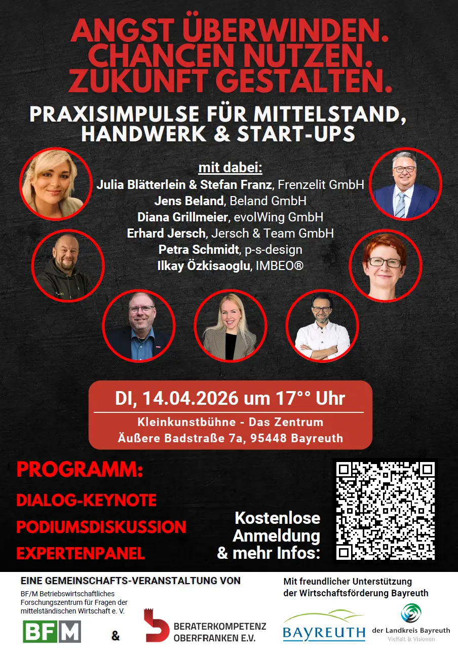 Veranstaltet wird der Abend von BF/M Bayreuth, dem Beraterkompetenz Oberfranken e.V. sowie den Wirtschaftsförderungen der Stadt und des Landkreises Bayreuth. Die Teilnahme ist kostenfrei.