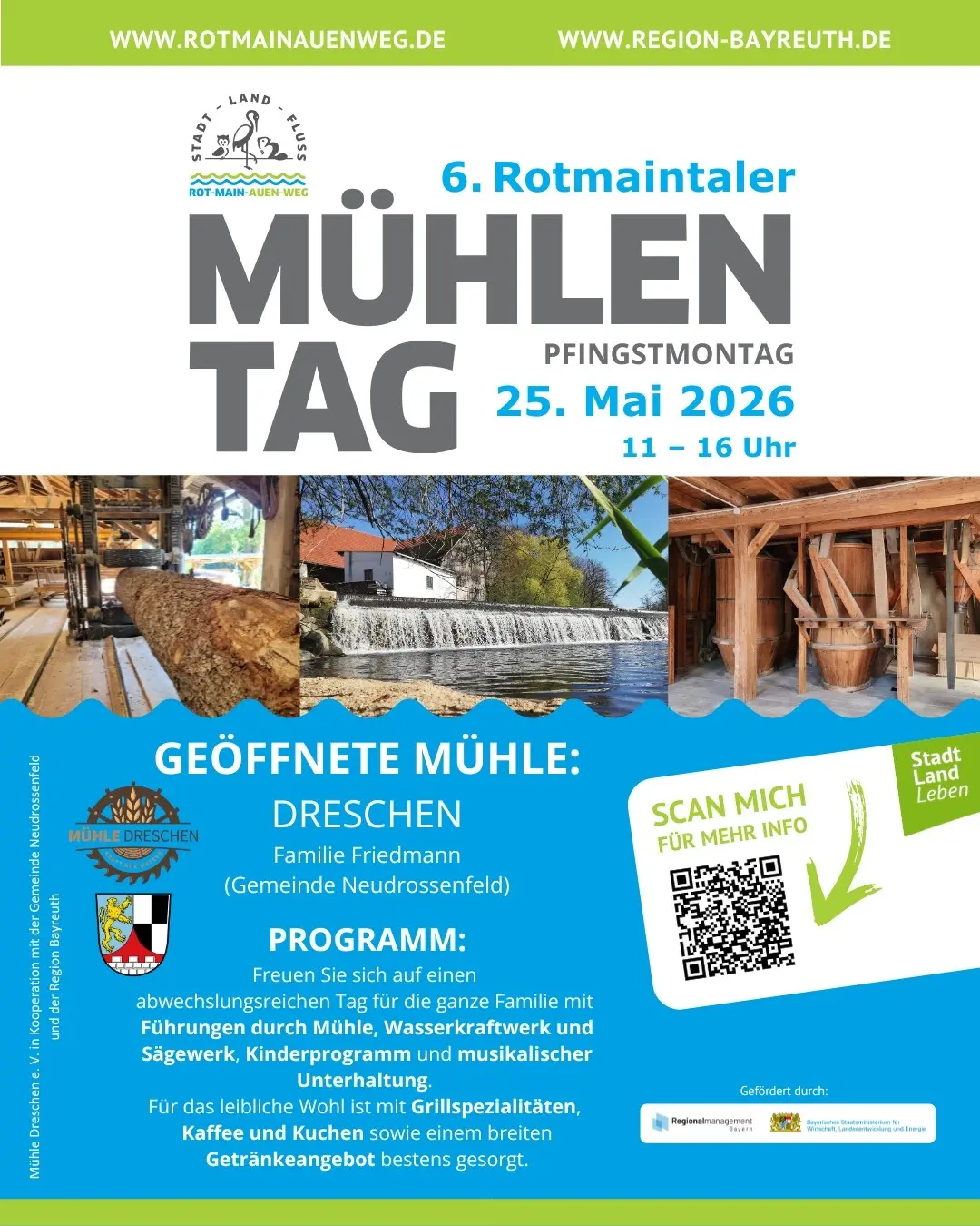 Zum Rotmaintaler Mühlentag am Pfingstmontag, 25. Mai 2026, ist von 11 bis 16 Uhr die Mühle in Dreschen in der Gemeinde Neudrossenfeld geöffnet.