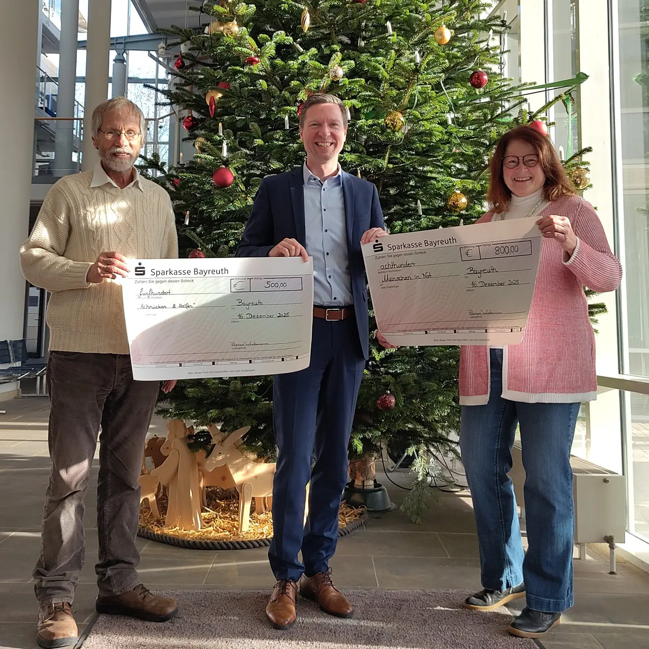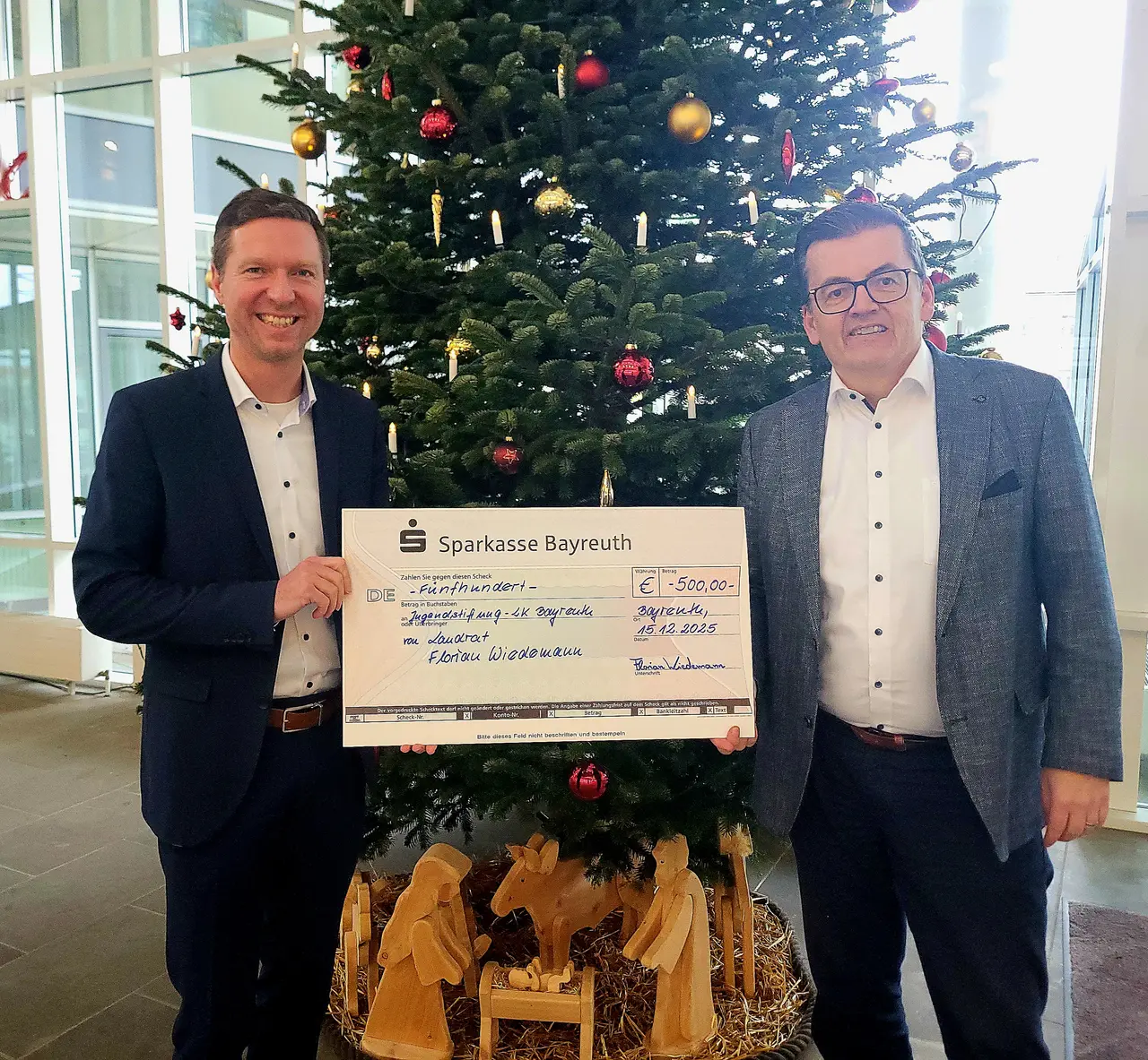 Auch dieses Jahr unterstützt Landrat Florian Wiedemann Organisationen, die sich mit großem Engagement für sozial benachteiligte und bedürftige Menschen einsetzen und caritative Projekte durchführen, mit einer Spende aus seinen persönlichen Verfügungsmitteln. Für die Kurier-Stiftung „Menschen in Not" nahm Gabi Schnetter einen Scheck über 800 Euro entgegen und für die die Aktion der Nordbayerischen Nachrichten „Schmücken und Helfen“ erhielt Thomas Knauber einen Scheck in Höhe von 500 Euro. Den Scheck über 500 Euro, der an die Jugendstiftung des Landkreises Bayreuth, die insbesondere die offene Jugendarbeit und sozial schwächere Familien unterstützt, geht, nahm Gerhard Herrmansdörfer entgegen.