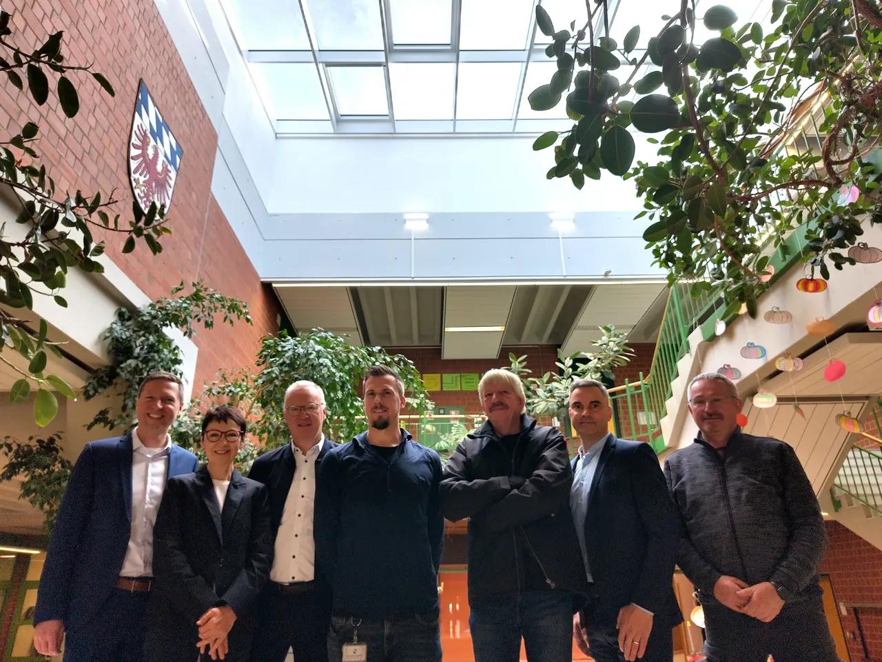 Anlässlich der Fertigstellung neuen Glasdaches über der Aula des Staatlichen Berufsschulzentrums trafen Landrat Florian Wiedemann, Kreisrätin Christa Reinert-Heinz und zuständige Mitarbeiter aus dem Landratsamt vor Ort mit der Schulleitung zur offiziellen Übergabe des neuen Glasdaches zusammen.