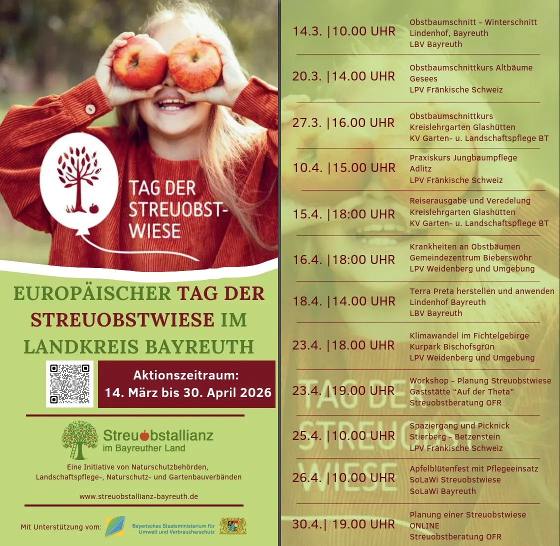Anlässlich des Europäischen Tags der Streuobstwiese am 24. April, finden im Aktionszeitraum bis zum 30. April im Landkreis Bayreuth zahlreiche Veranstaltungen statt. Unter dem Motto „Gutes aus Streuobst“ richtet sich der Fokus auf viele Facetten von Streuobstwiesen – von regionalen Produkten und alten Obstsorten bis hin zu Artenvielfalt und gelebter Kulturlandschaft.