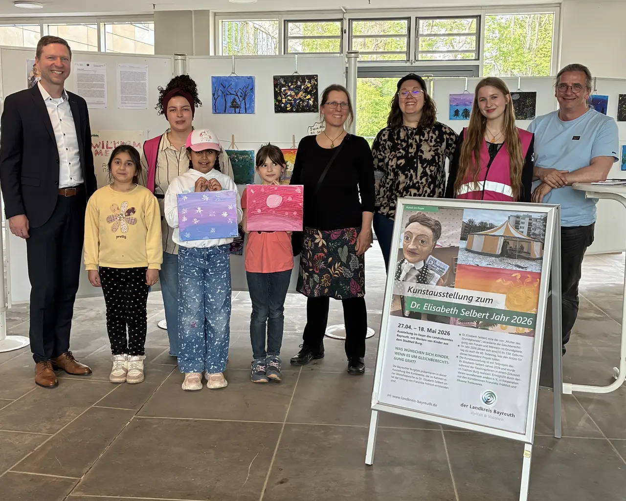 Das Foto zeigt die Eröffnung der Kunstausstellung der BurgKids zum Elisabeth-Selbert-Jahr im Landratsamt Bayreuth mit Landrat Florian Wiedemann (links), der Künstlerin Franziska Fröhlich (Mitte), Lena Wenz (Dritte von rechts) vom Vorstand und dem Vorsitzenden Marco Marino (rechts) des Vereins „wundersam anders“ mit Betreuerinnen und drei Mädchen von den BurgKids.