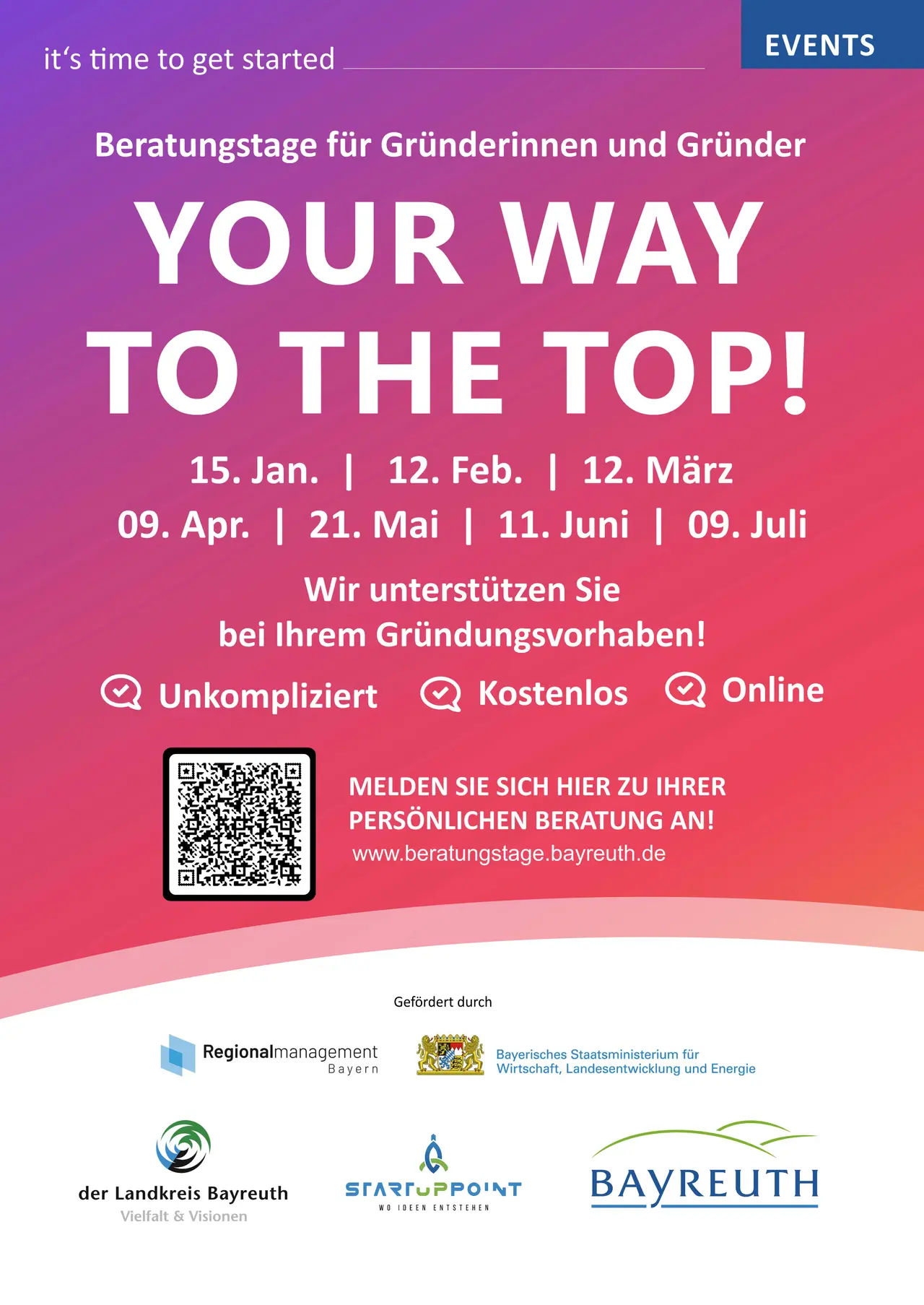 Für ein Einzelberatungsgespräch können Sie sich bei der Wirtschaftsförderung der Stadt Bayreuth unter 0921 25 1583 anmelden, alternativ auch per E-Mail an: wirtschaftsfoerderung@stadt.bayreuth.de.